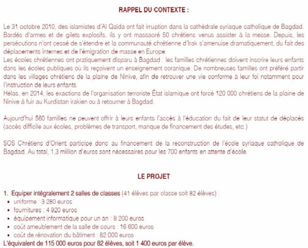 Je fais donc appel à vous et à votre générosité dans un seul but: encourager et soutenir ce projet de reconstruction d'une école en Irak.