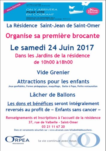 Opération nettoyage de printemps et vide grenier !  L'équipe de la résidence ORPEA Saint-Jean de Saint-Omer se mobilise et organise sa premiere Brocante dans les jardins de la résidence le samedi 24 juin 2017 de 10h à 18hC'est  l'occasion de venir passer une après-midi conviviale ! 3€ le mètre linéaire pour obtenir un stand ! Renseignements à l'accueil de la résidence ou au 03 21 11 67 20
