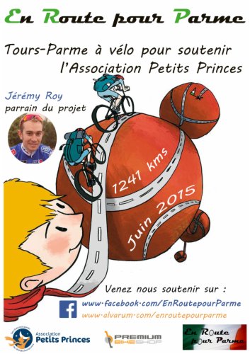 En Route pour Parme, c'est l'aventure de deux cyclistes qui, pour aider une association et renforcer le jumelage Tours-Parme, ont décidé de se lancer sur les routes de l'Hexagone et de la botte Italienne. Pour atteindre ce but et offrir à l'association une aide non-négligeable et une couverture médiatique supplémentaire, nous avons besoin de vous, Aimez, Partagez et Soutenez l'Association Petits Princes via cette page et notre page facebook.