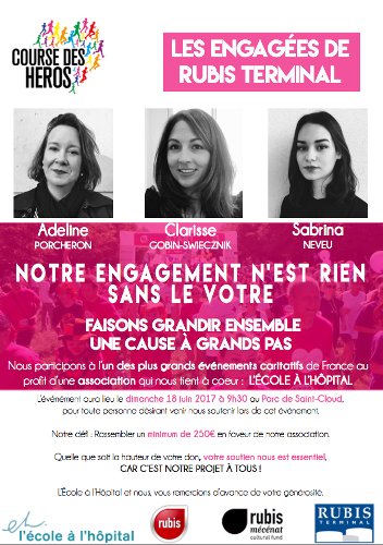 Composé d'Adeline Porcheron, Clarisse Gobin-Swiecznik et Sabrina Neveu, notre groupe "Les Engagées de Rubis Terminal" participera à la Course des Héros le 18 juin dont le but est de soutenir notre association "L'École à l'Hôpital".
