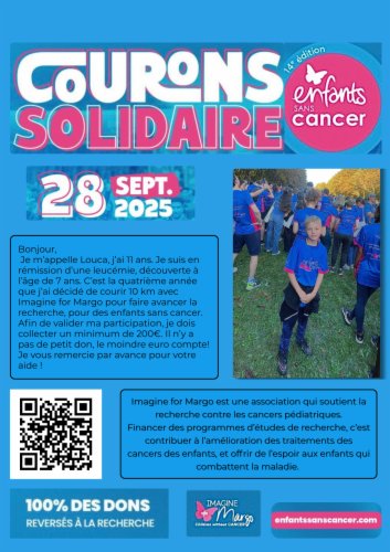 Je m'appelle Louca, j'ai 11 ans. Je suis en rémission d'une leucémie, découverte à l'âge de 7 ans. C'est la quatrième année que j'ai décidé de courir 10 km avec Imagine for Margo pour faire avancer la recherche, pour des enfants sans cancer.