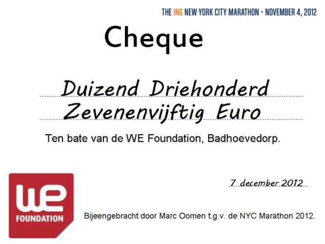 Ter gelegenheid van de marathon draag ik mijn inspanning graag op aan alle kinderen met stofwisselingsziekten en wil proberen zo veel mogelijk geld in te zamelen voor de WE FOUNDATION zodat onderzoek naar behandelingsmethoden voor zeldzamen stofwisselingsziekten ondersteund kan worden. Meer informatie kan je vinden op www.wefoundation.nl